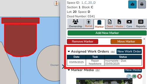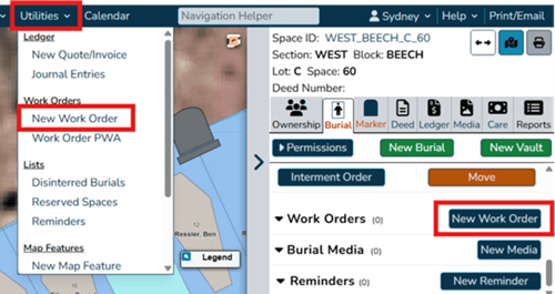 - Through the right-hand flyout, on the ‘Ownership’ tab, ‘Burial’ tab, ‘Marker’ tab and more, there will be ‘New work order’ buttons.