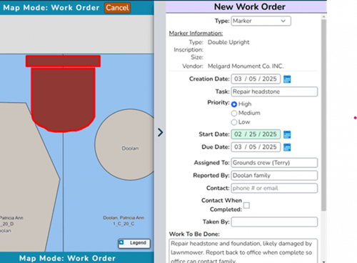 Office staff and field crews work from a single source of truth, with work orders tied directly to specific spaces, markers, or burials. Relevant information can auto‑populate, reducing errors and saving time.