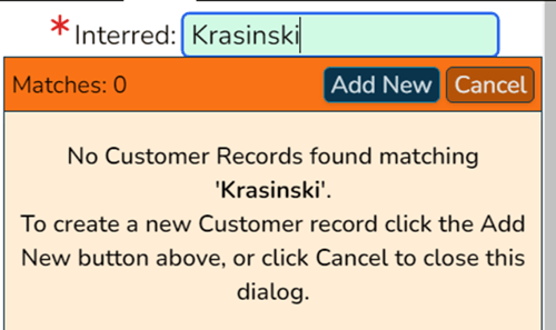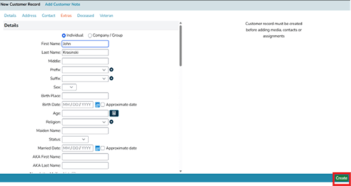 - Next, a popup will appear. The only fields that are required to create a customer record are the first and last names. If you have it, we recommend filling in the birth date to avoid confusion if someone else in the cemetery has the same name.
