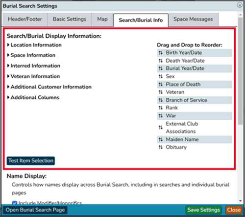- Underneath the ‘Search/burial display information’ are several collapsed headings; click on them to expand them. Check or uncheck options to choose what information will appear to the public.